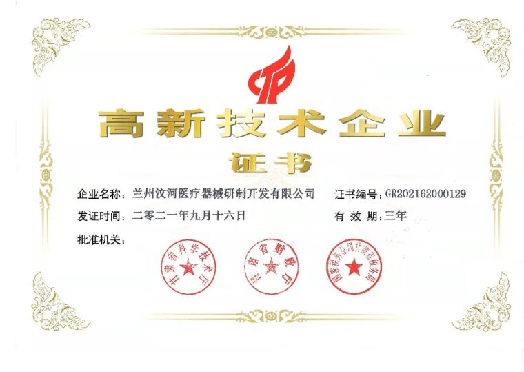 蘭州汶河醫療器械研制開發有限公司成立于2003年11月11日,是一家集醫療器械研制、開發、生產、銷售及服務于一體的科技創新型企業。2010年天津紅日藥業增資我司,擴地建廠,2012年、2015年、2018年相繼被認定為國家高新技術企業,2019年被認定為甘肅省科技型中小企業。目前擁有涉及醫療器械領域的發明專利4項,實用新型專利60余項,日內瓦金獎1項,醫療器械產品注冊證22項;2016年、2018年分別獲甘肅省專利獎各1項,2018年獲甘肅省技術發明獎1項。多個項目獲得國家科技部火炬中心“科技型中小企業技術創新基金”,甘肅省、蘭州市科技項目的立項扶持。2020年獲得蘭州市十大誠信企業,汶河公司創始人董黎先生于2019年獲發明人獎。
